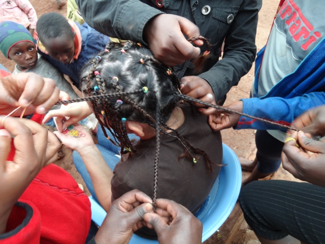 As we waited for our lunch to be prepared, Joy decided to get her hair braided by the girls there. They were pulling her hair every which way. They told her "if you want beautiful, don't feel pain!"